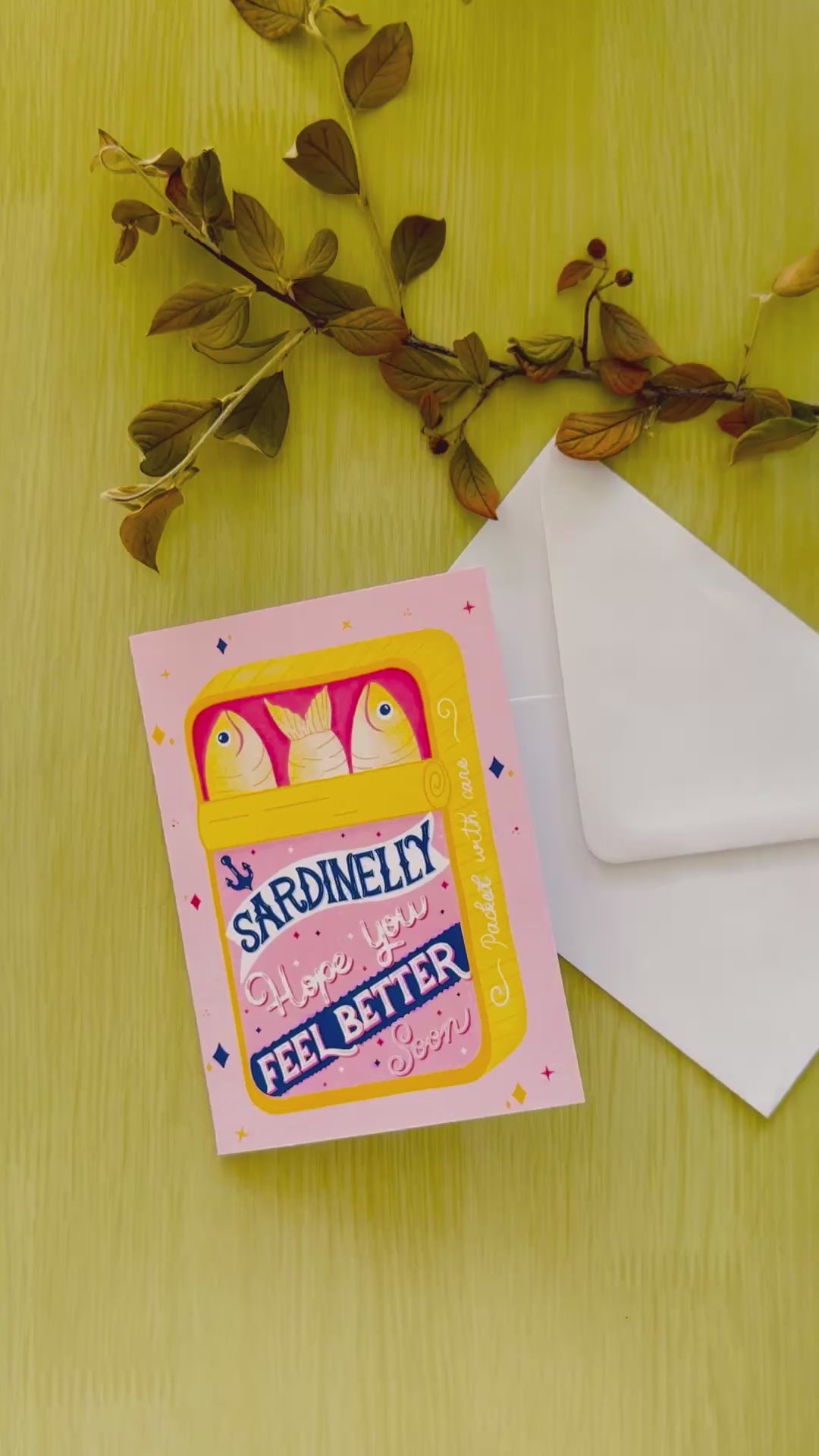 Send a little silliness and a lot of warmth with the “Sardinelly — Hope You Feel Better Soon” card. This cheerful pink & yellow sardine tin design hand drawn by be unique by Romy is available as a novelty tin-shaped die-cut card or a classic rectangular card — choose the style that suits your recipient.